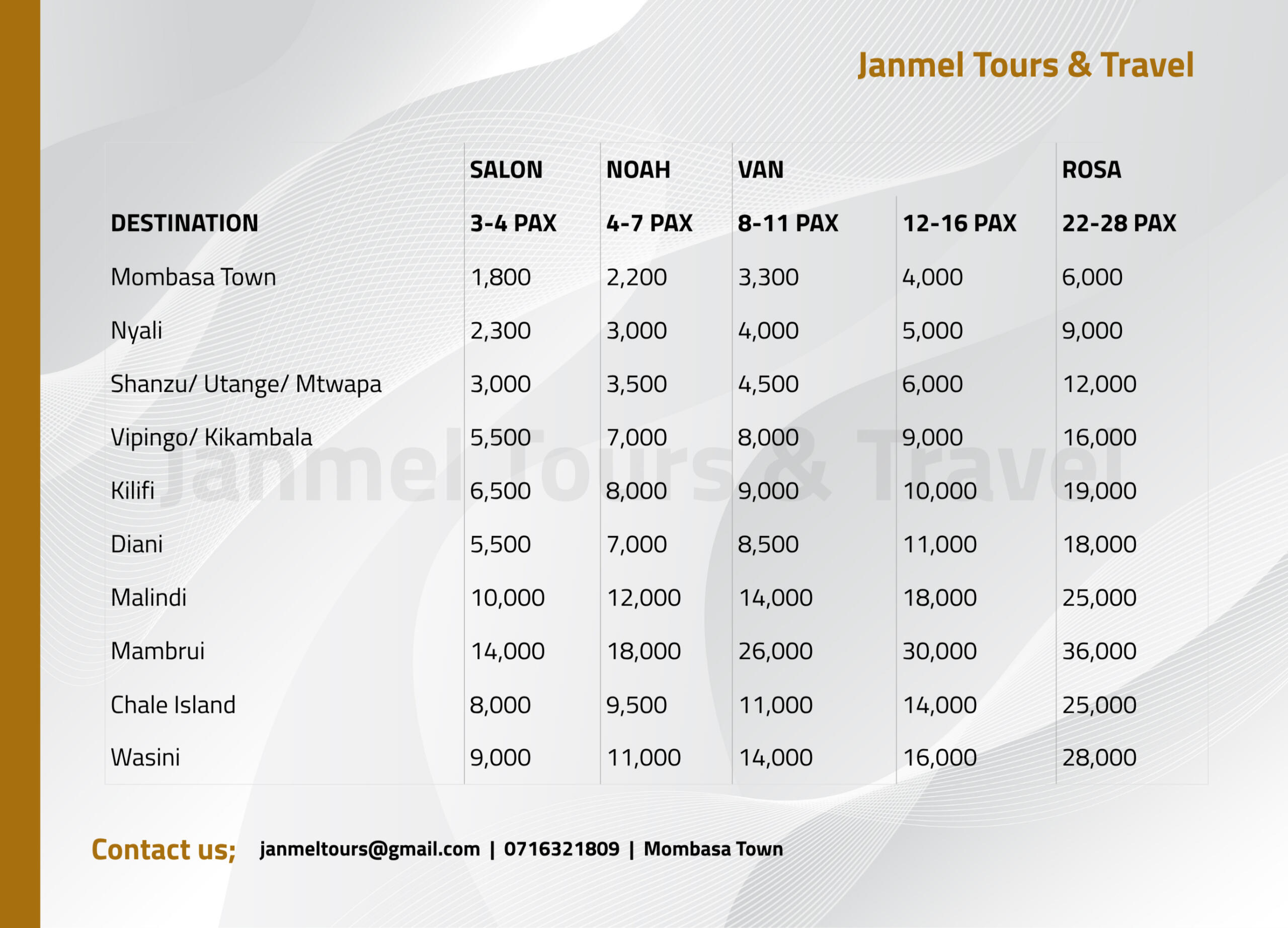 The owner of Jamnel Tours, Destine, has worked as a cab driver for more than 5 years. In this time, he has taken many tourists to all the amazing sports in the South coast to the North coast. You and your loved ones will be in safe hands and you will experience the Kenyan coast like never before!